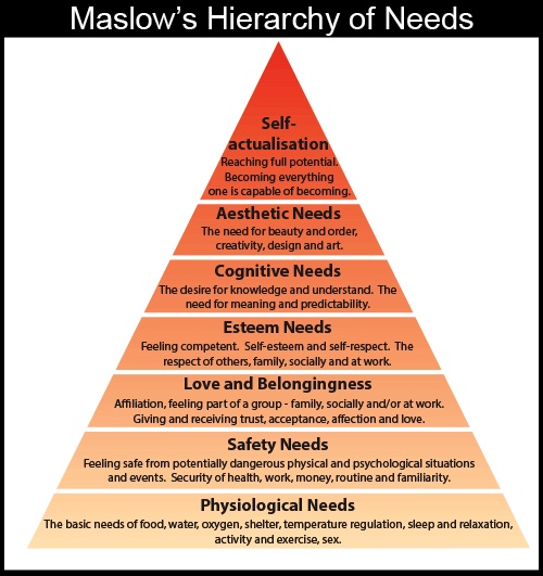 They then move on to issues of self-esteem, cognitive needs, and aesthetic needs, and finally, at the top of the pyramid, there is self-actualization, or achieving your full potential as a human being.